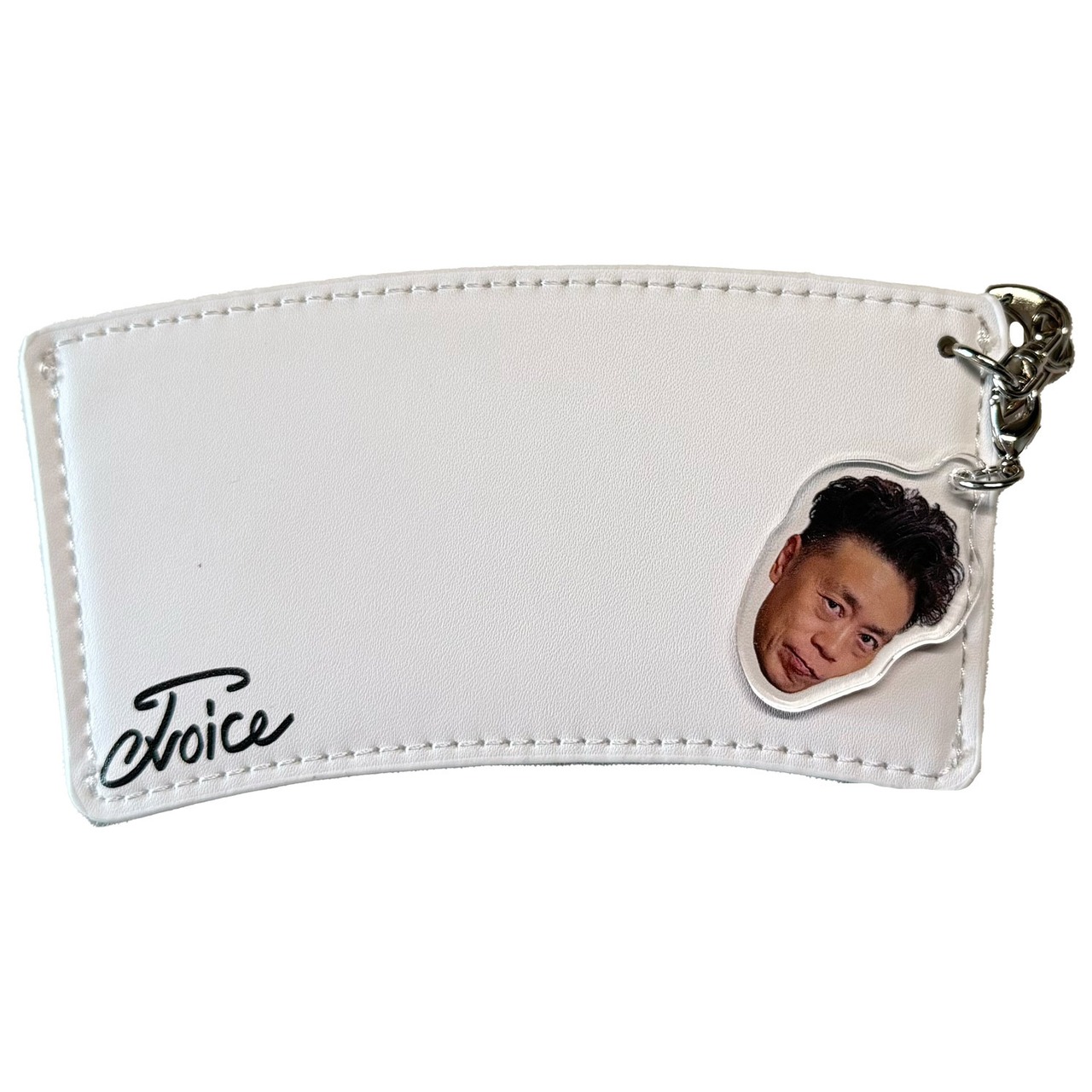 取り外しも可能な丈さんのチャームが付いたカップスリーブです。表面は白地にJ-voiceのデザイン、裏面にはワンチャンの足あと柄。